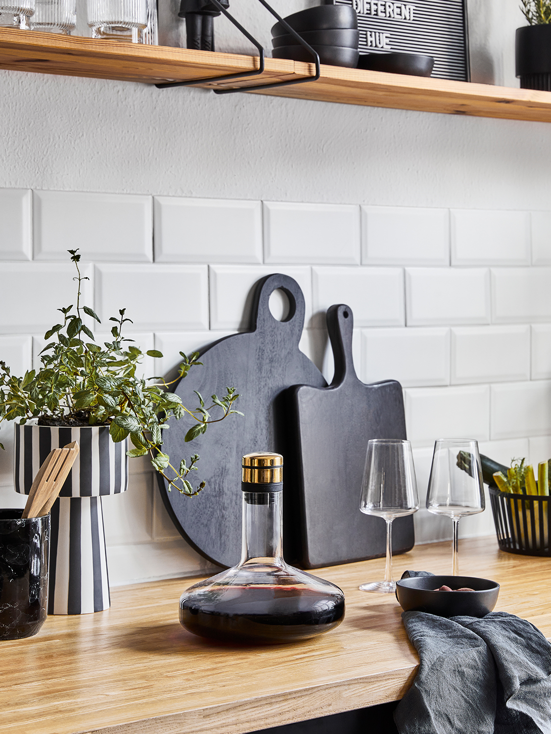 Ideal para todos los amantes del vino: simplemente coloca este decantador en una botella abierta y dale la vuelta para que el vino entre en el decantador sin desperdiciar ni una gota. Así podras servir el vino directamente en este elegante decantador. Y después, el vino se puede volver a verter en la botella original. Este decantador de vino logra combinar funcionaidad y diseño de una manera impresionante: no solo es práctico, sino que también llama la atención en la mesa. Su diseño simple y su elegancia combinan a la perfección con el estilo escandinavo.